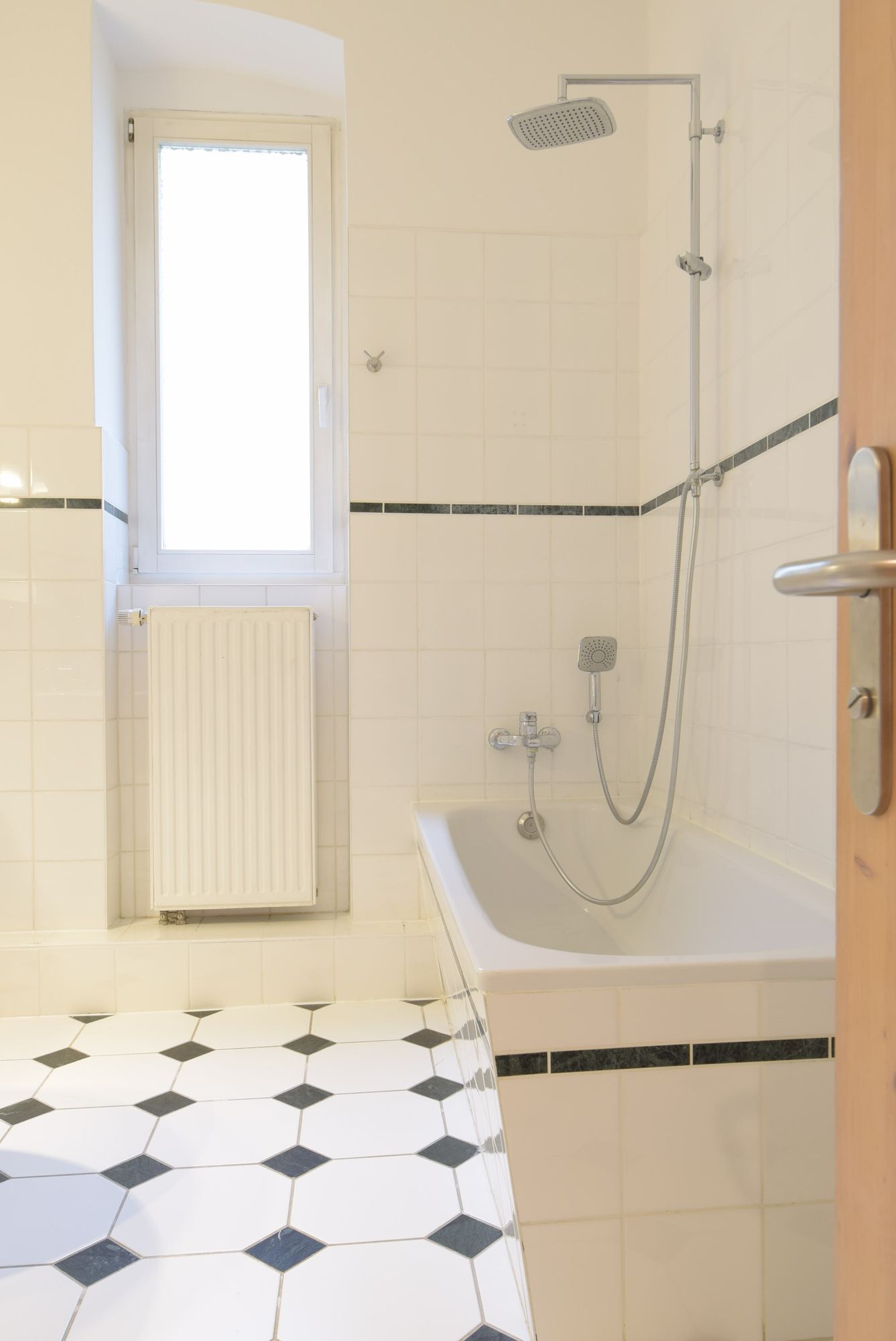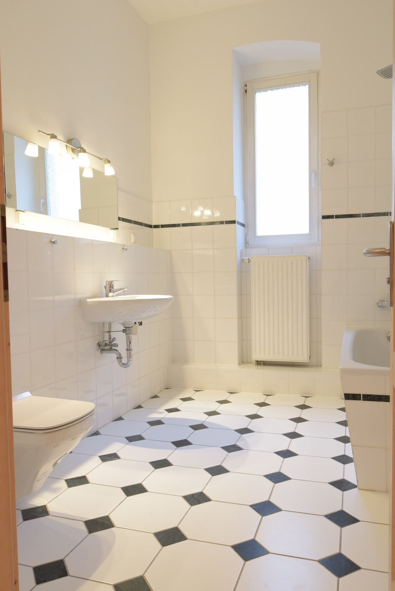 + Badezimmer mit Fenster, schwarz/weißen Fliesen, hängendem WC, Waschbecken, Badewanne/Dusche, Anschluss für Waschmaschine